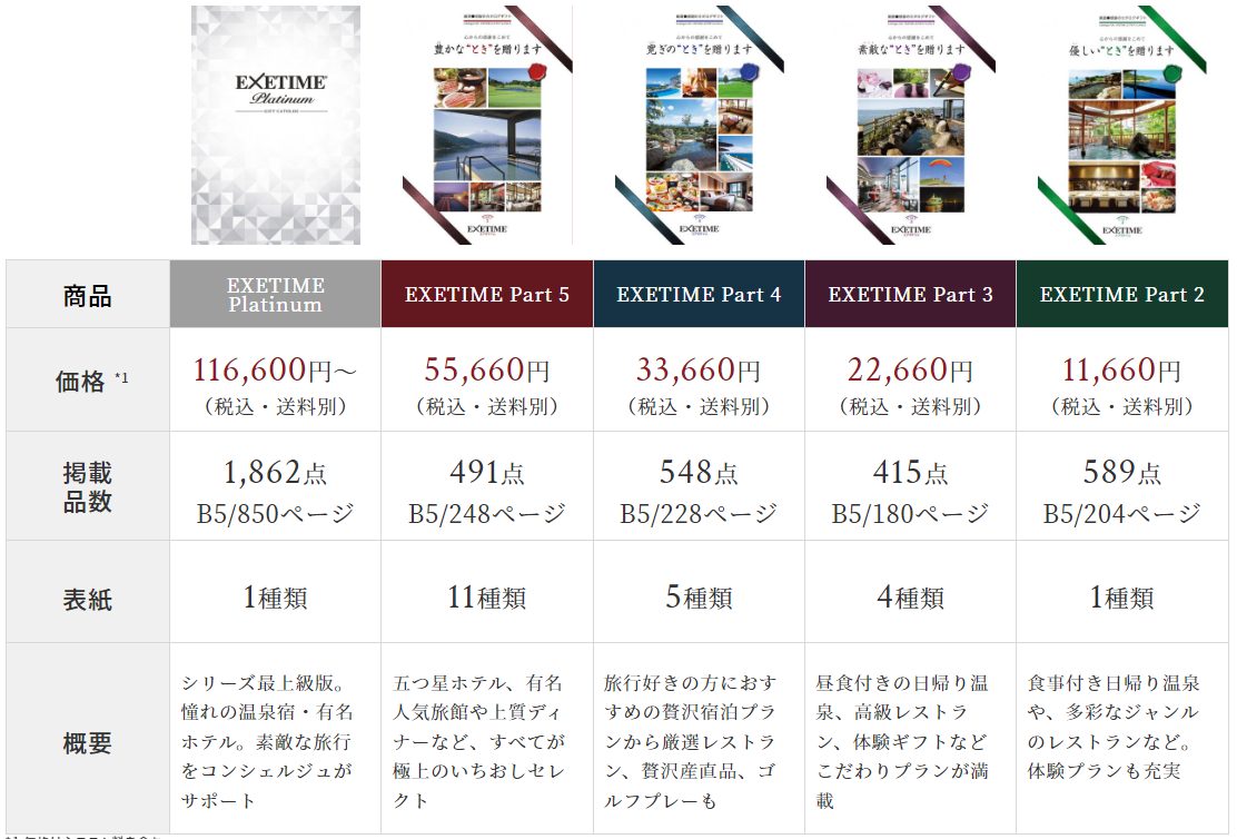 | 誰もが聞いたことがある有名旅館やホテルへの宿泊プラン多数。バイキングや和会席の2食付きで、温泉も食事も満足できる。「これは結構な値段がするはず」と贈った相手もすぐ気付くレベル。 | ||||||||||||||||||||